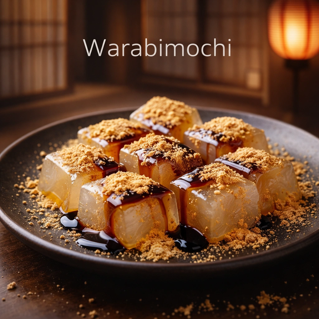 Warabimochi adalah makanan Jepang tradisional khas Osaka dengan tekstur kenyal lembut, taburan kinako, dan sirup kuromitsu yang autentik.