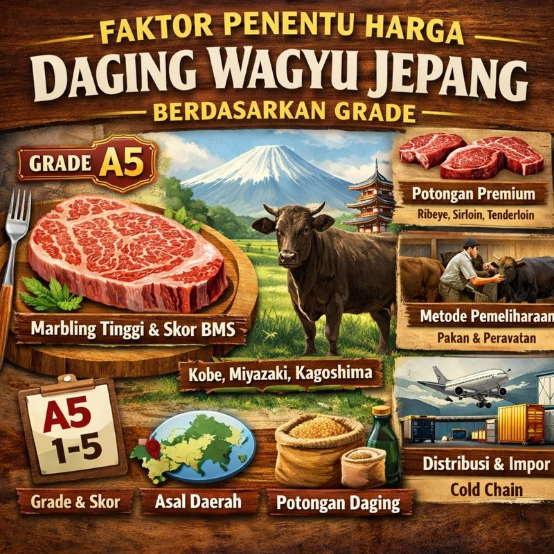 Harga Daging Wagyu Jepang ditentukan oleh grade, marbling, potongan, asal daerah, dan metode pemeliharaan. Simak faktor lengkapnya sebelum membeli.