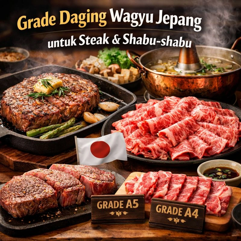 Panduan lengkap grade Daging Wagyu Jepang terbaik untuk steak dan shabu-shabu, mulai A3, A4, hingga A5, lengkap dengan tips memilih sesuai kebutuhan.